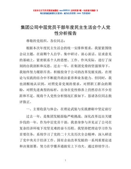 / 集团公司中层党员干部年度民主生活会个人党性分析报告