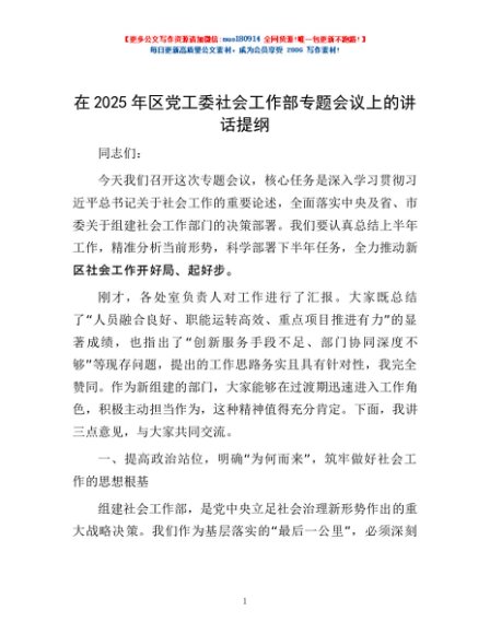 / 在2025年区党工委社会工作部专题会议上的讲话提纲