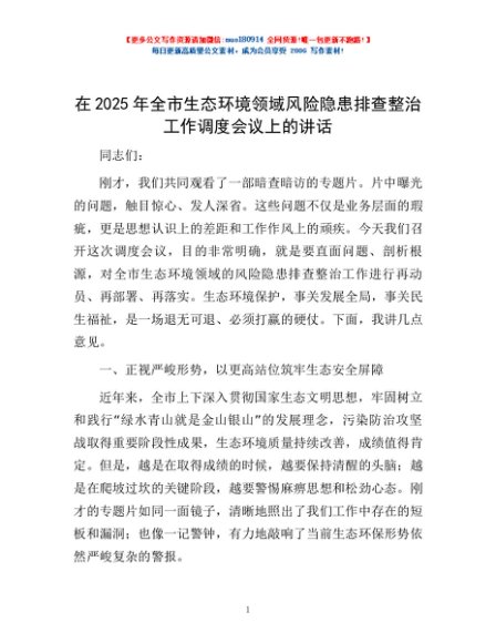 / 在2025年全市生态环境领域风险隐患排查整治工作调度会议上的讲话
