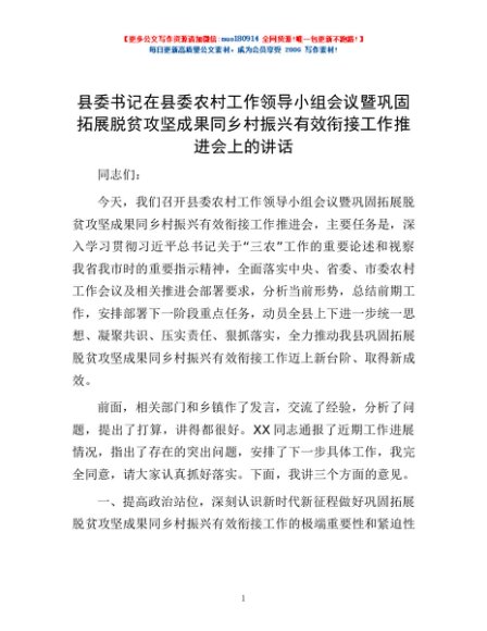 / 县委书记在县委农村工作领导小组会议暨巩固拓展脱贫攻坚成果同乡村振兴有效衔接工作推进会上的讲话