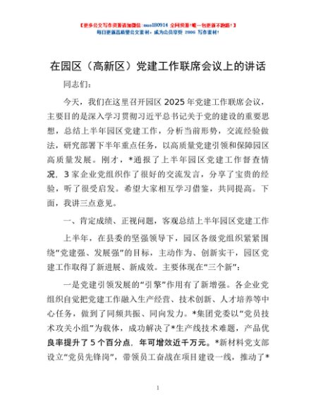 / 在园区(高新区)党建工作联席会议上的讲话