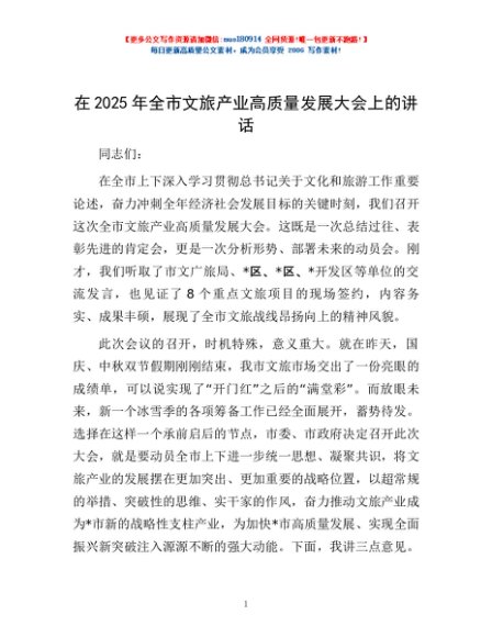 / 在2025年全市文旅产业高质量发展大会上的讲话