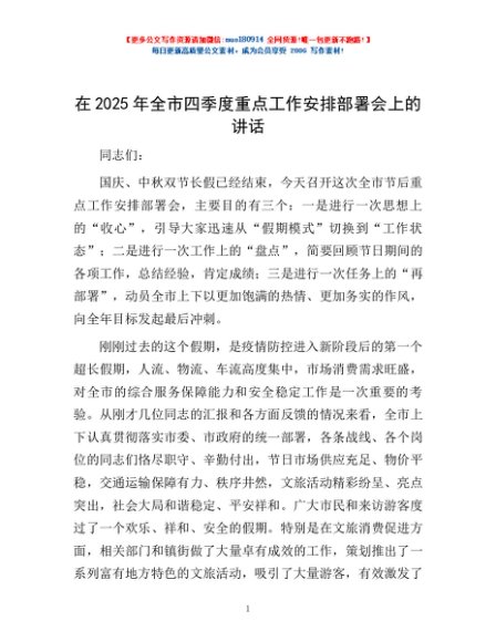 / 在2025年全市四季度重点工作安排部署会上的讲话