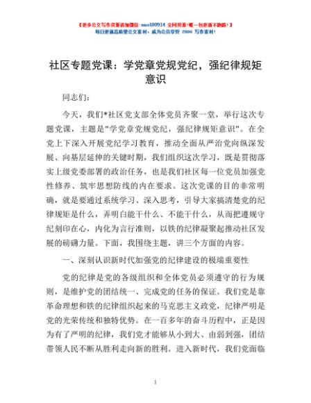 社区专题党课:学党章党规党纪,强纪律规矩意识