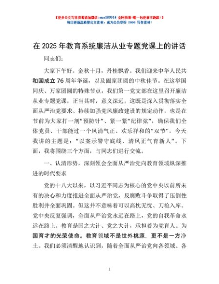 / 在2025年教育系统廉洁从业专题党课上的讲话
