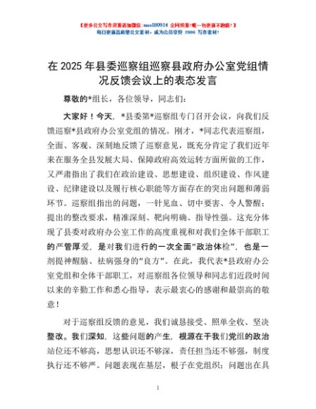 / 在2025年县委巡察组巡察县政府办公室党组情况反馈会议上的表态发言