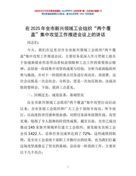 / 在2025年全市新兴领域工会组织“两个覆盖”集中攻坚工作推进会议上的讲话