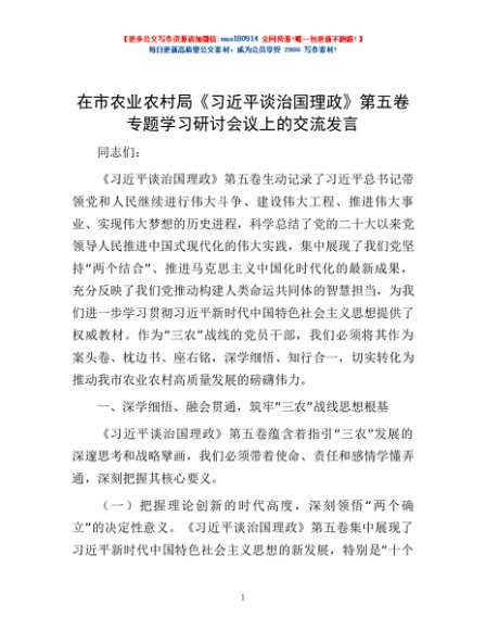 / 在市农业农村局《习近平谈治国理政》第五卷专题学习研讨会议上的交流发言
