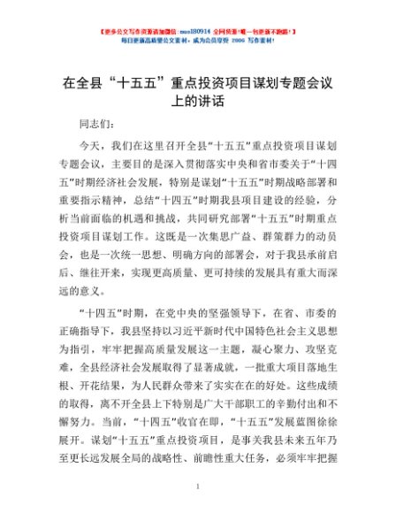 / 在全县“十五五”重点投资项目谋划专题会议上的讲话