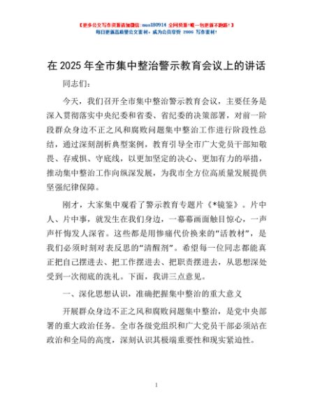 / 在2025年全市集中整治警示教育会议上的讲话