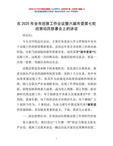 / 在2025年全市巡察工作会议暨六届市委第七轮巡察动员部署会上的讲话