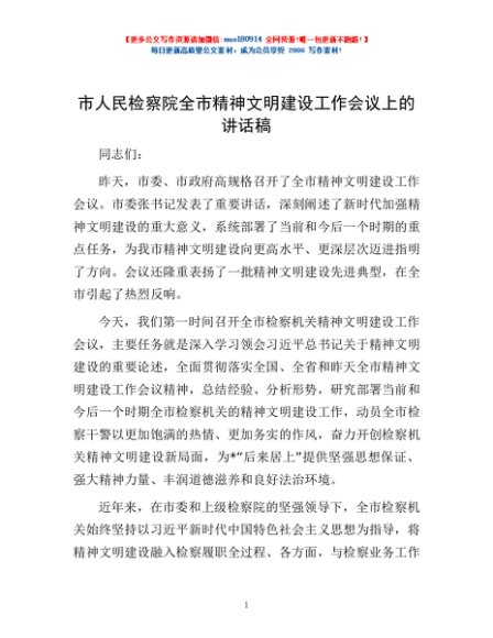 / 市人民检察院全市精神文明建设工作会议上的讲话稿