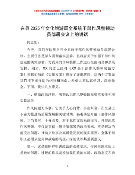 / 在县2025年文化旅游局全系统干部作风整顿动员部署会议上的讲话