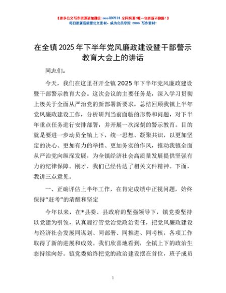 / 在全镇2025年下半年党风廉政建设暨干部警示教育大会上的讲话