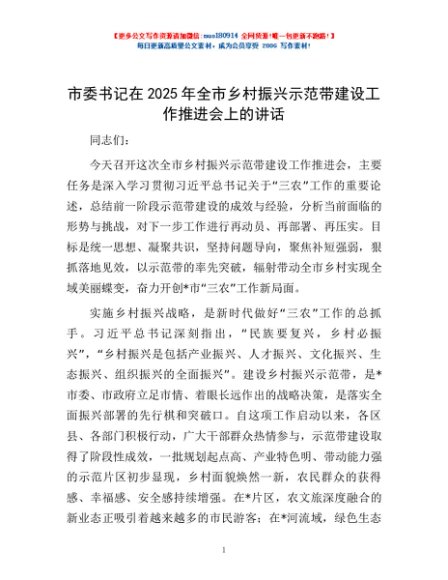 / 市委书记在2025年全市乡村振兴示范带建设工作推进会上的讲话