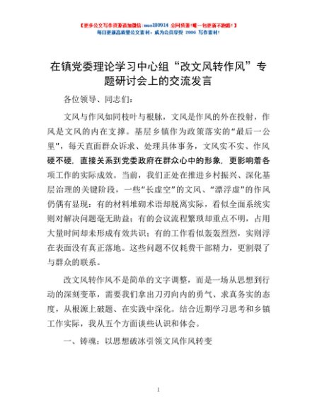 / 在镇党委理论学习中心组“改文风转作风”专题研讨会上的交流发言
