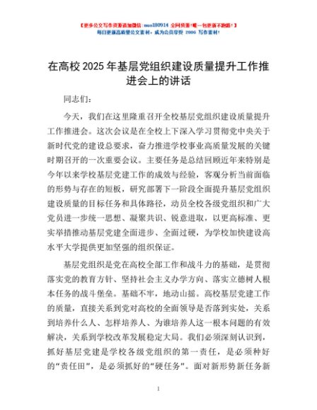 / 在高校2025年基层党组织建设质量提升工作推进会上的讲话
