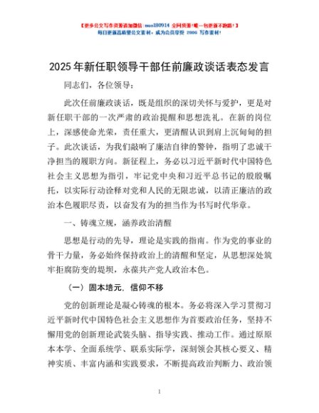 / 2025年新任职领导干部任前廉政谈话表态发言