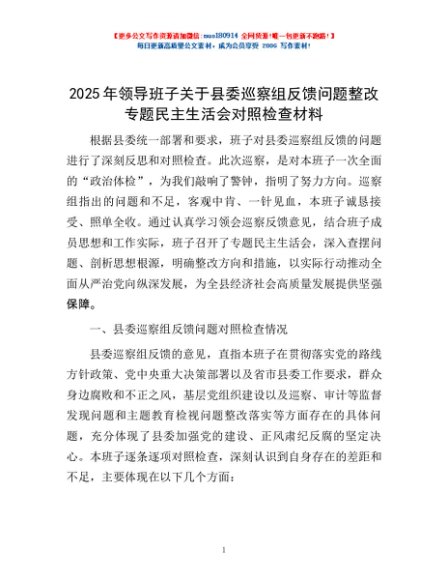 / 2025年领导班子关于县委巡察组反馈问题整改专题民主生活会对照检查材料