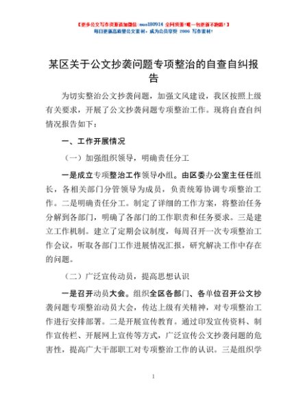 / 某区关于公文抄袭问题专项整治的自查自纠报告