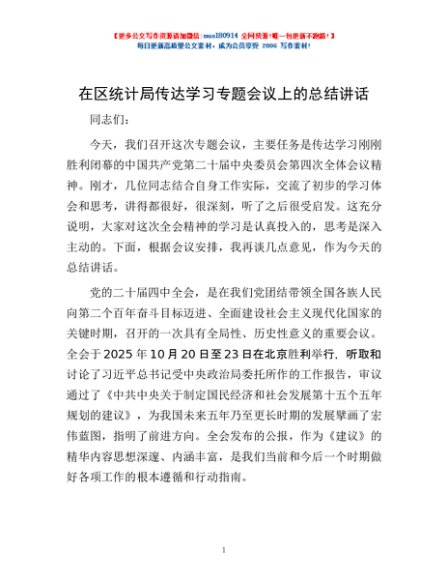 / 在区统计局传达学习专题会议上的总结讲话