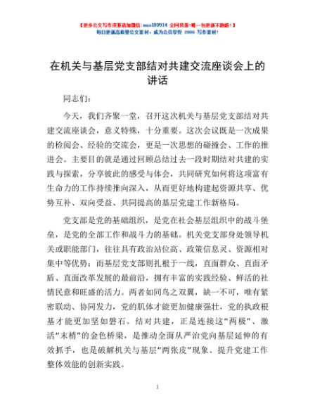 / 在机关与基层党支部结对共建交流座谈会上的讲话
