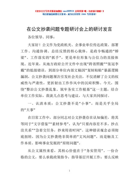 / 在公文抄袭问题专题研讨会上的研讨发言