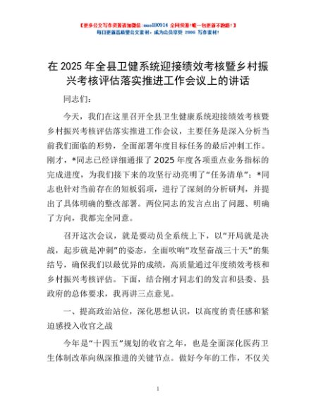 / 在2025年全县卫健系统迎接绩效考核暨乡村振兴考核评估落实推进工作会议上的讲话