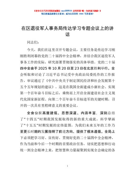 / 在区退役军人事务局传达学习专题会议上的讲话