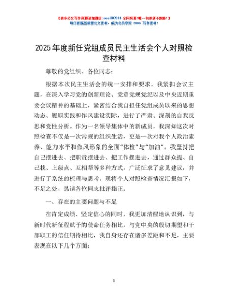 / 2025年度新任党组成员民主生活会个人对照检查材料
