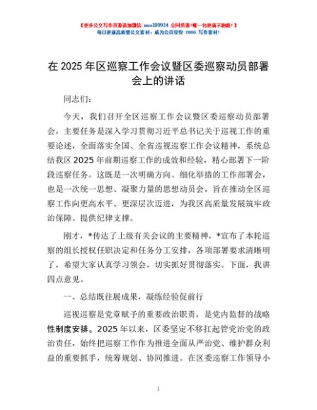 / 在2025年区巡察工作会议暨区委巡察动员部署会上的讲话