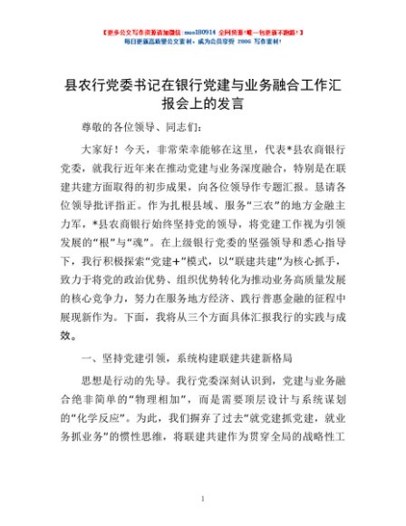 / 县农行党委书记在银行党建与业务融合工作汇报会上的发言
