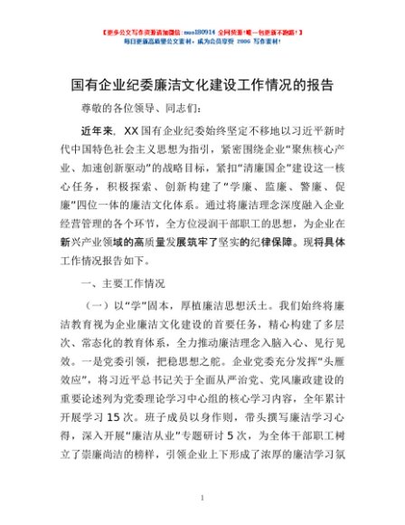 / 国有企业纪委廉洁文化建设工作情况的报告
