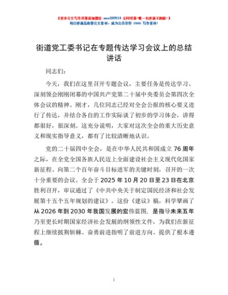 / 街道党工委书记在专题传达学习会议上的总结讲话