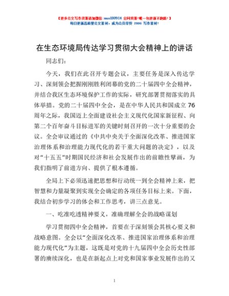 / 在生态环境局传达学习贯彻大会精神上的讲话