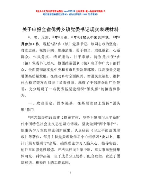 / 关于申报全省优秀乡镇党委书记现实表现材料