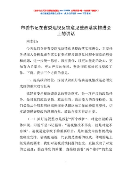 / 市委书记在省委巡视反馈意见整改落实推进会上的讲话
