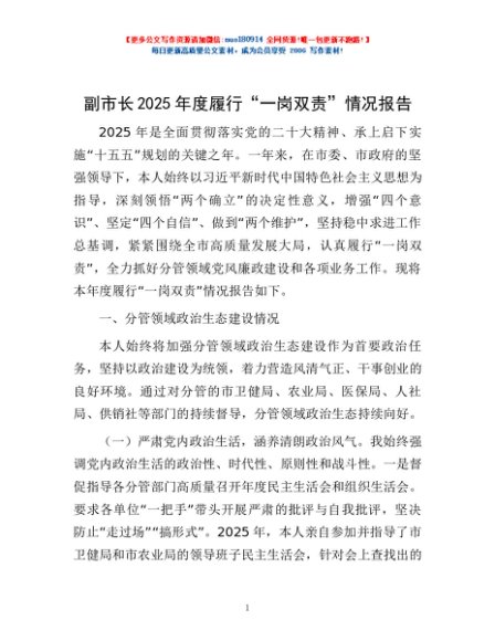 / 副市长2025年度履行“一岗双责”情况报告