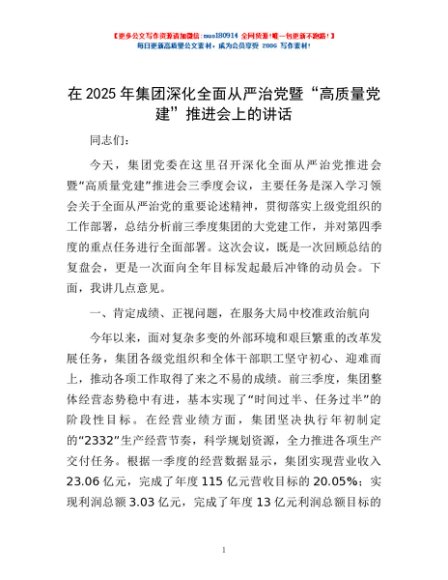 / 在2025年集团深化全面从严治党暨“高质量党建”推进会上的讲话