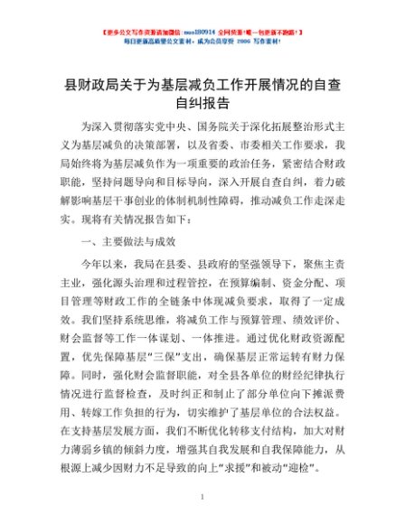 / 县财政局关于为基层减负工作开展情况的自查自纠报告