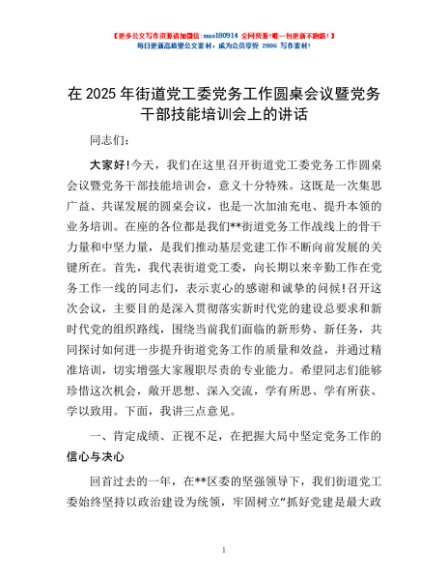 / 在2025年街道党工委党务工作圆桌会议暨党务干部技能培训会上的讲话