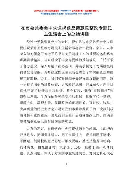 / 在市委常委会中央巡视组反馈意见整改专题民主生活会上的总结讲话