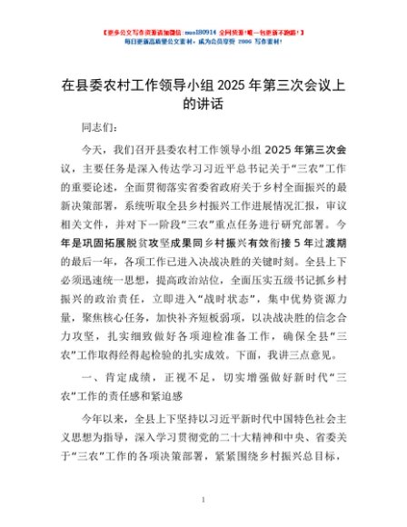 / 在县委农村工作领导小组2025年第三次会议上的讲话