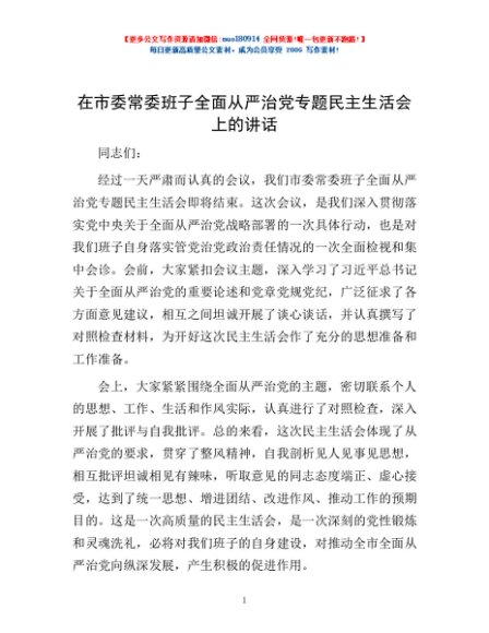 / 在市委常委班子全面从严治党专题民主生活会上的讲话