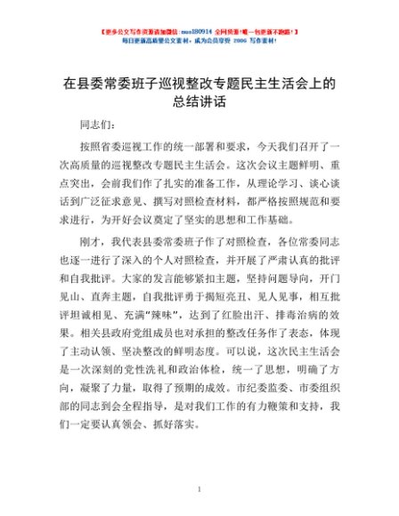/ 在县委常委班子巡视整改专题民主生活会上的总结讲话