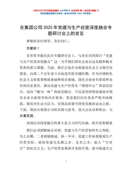 / 在集团公司2025年党建与生产经营深度融合专题研讨会上的发言