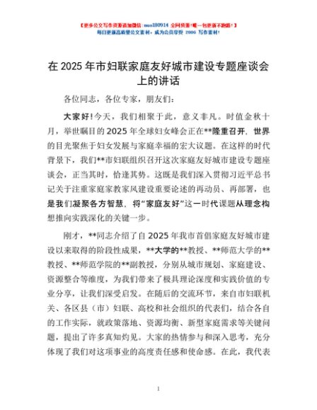 / 在2025年市妇联家庭友好城市建设专题座谈会上的讲话
