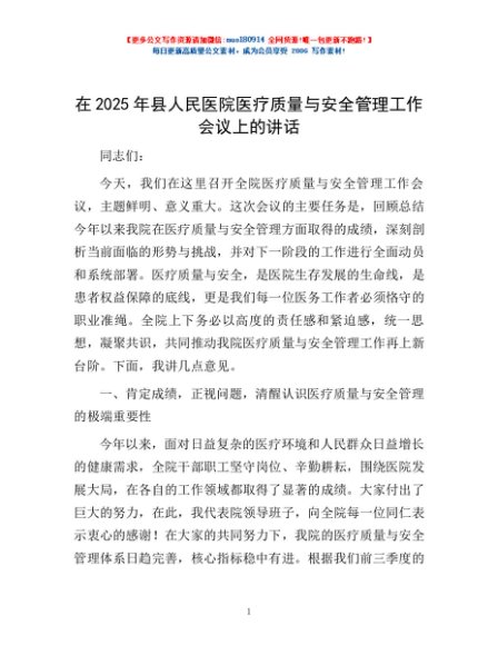 / 在2025年县人民医院医疗质量与安全管理工作会议上的讲话