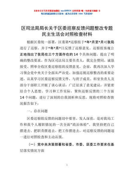 / 区司法局局长关于区委巡察反馈问题整改专题民主生活会对照检查材料