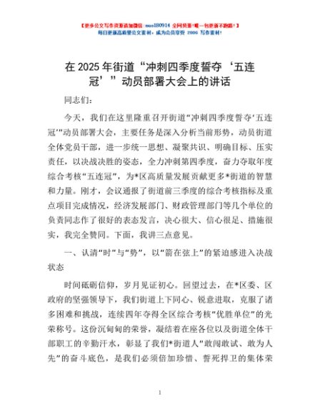 / 在2025年街道“冲刺四季度誓夺‘五连冠’”动员部署大会上的讲话